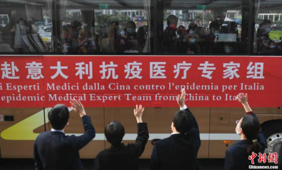 资料图:3月17日,浙江省组建中国抗疫医疗专家组共12人赴意大利,专家组将与当地医院和专家开展新冠肺炎防控的经验分享和交流,提供防控和诊疗指导与咨询,并对当地中国使领馆、中资企业人员、留学生和华人华侨开展医疗卫生指导和帮助。 图为送行者在杭州向即将奔赴意大利的专家挥手致意。 王刚 摄