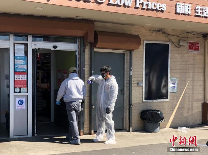 截至当地时间3月24日上午,全美新冠病毒感染者超过4万,遍布50个州。纽约州感染者2万多,接近全国一半,被媒体称为美国疫情的“震中”。图为纽约市华人聚居区法拉盛的一家华人超市门前,一名身穿防护服的超市员工正在向进入超市的顾客喷洒消毒剂。 中新社记者 马德林 摄