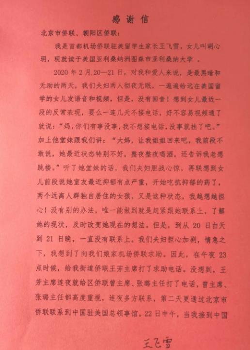 3月23日上午10时,北京市侨联值班员接到一条朝阳区侨联发来的求助信息,首都机场南路东里居民王飞雪请侨联组织协助联系在美国亚利桑那大学留学的女儿。