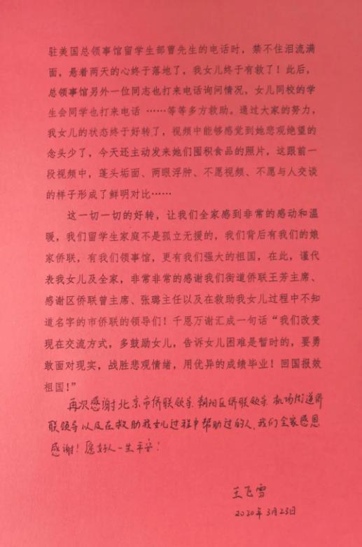 王飞雪激动地对侨联工作人员说,近期洛杉矶地区疫情加重,孩子情绪有些波动,近两天又联系不上孩子,作为母亲感到特别无助,整晚上都没有睡着,没想到这么快就通过总领馆、学校和海外侨领联系上了孩子,真的非常感动,感谢侨联领导的关心和重视,侨联真是我们的娘家人、贴心人啊!