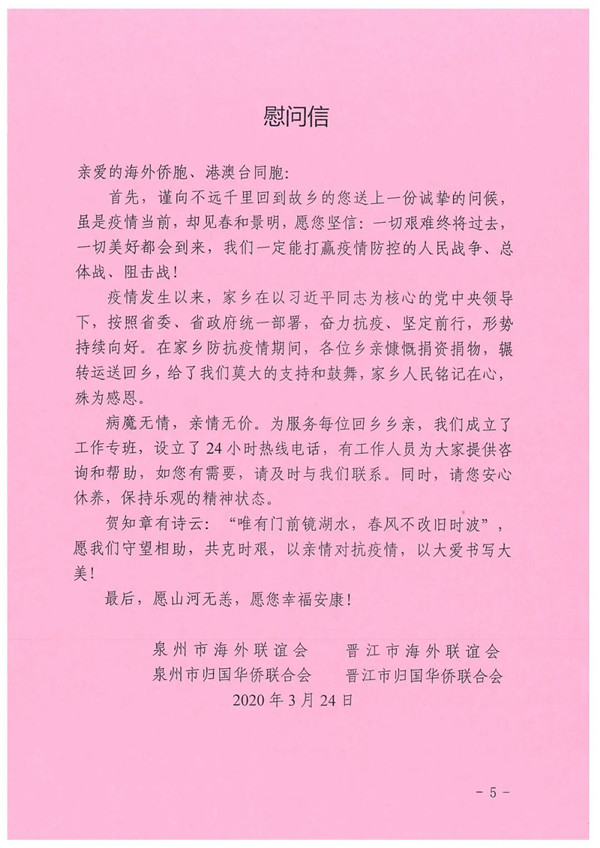 三是送上一封慰问信。组织撰写由市海联会、市侨联联合发布的一封信,向在泉州集中隔离的海外侨胞、港澳台同胞及外籍人士表示关心和慰问,引导他们遵守有关工作规则。委托各县(市、区)委侨联向每位集中医学观察的海外侨胞和港澳台同胞转送慰问信。目前,已发放1251份。