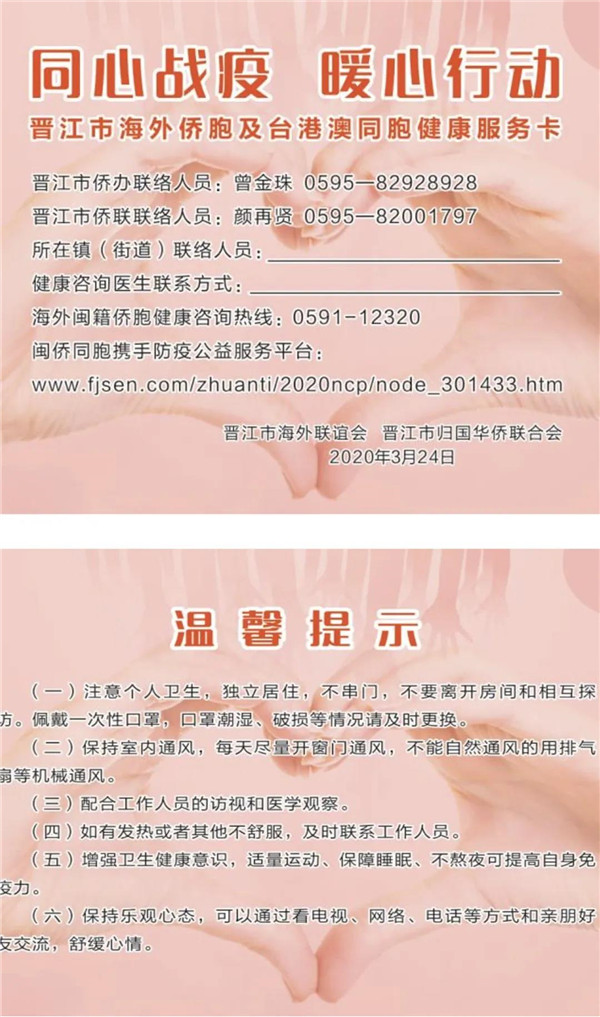 五是发放一张健康服务卡。联合市委统战部组织制作健康服务卡模板(包含身体健康指标、健康咨询医生、工作人员联系方式),并附温馨提示相关内容,由各县级统战部、侨联牵头印刷,并分发到每一位隔离侨胞,给侨胞最贴心的服务。(供稿:泉州市侨联 赖彩凤)