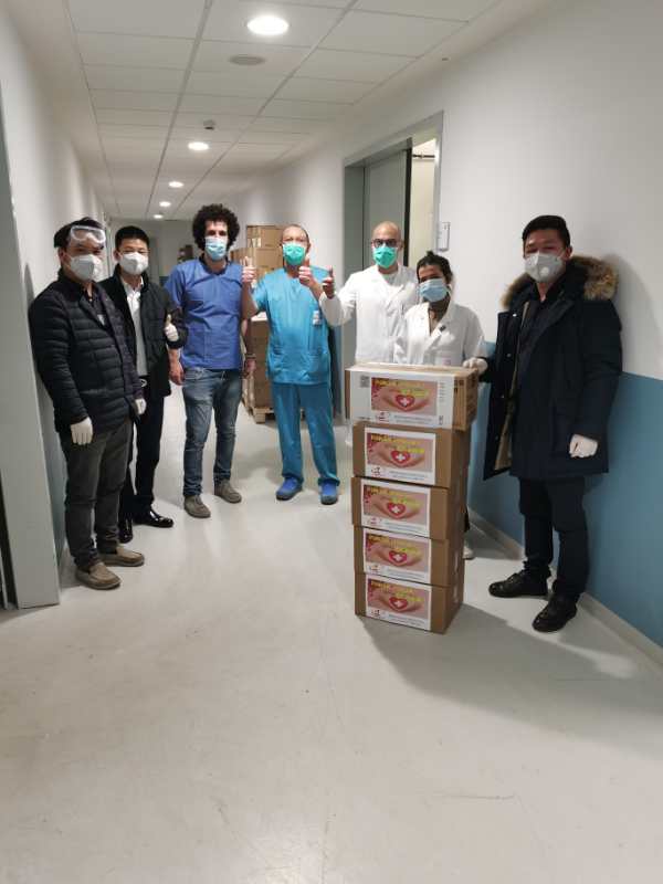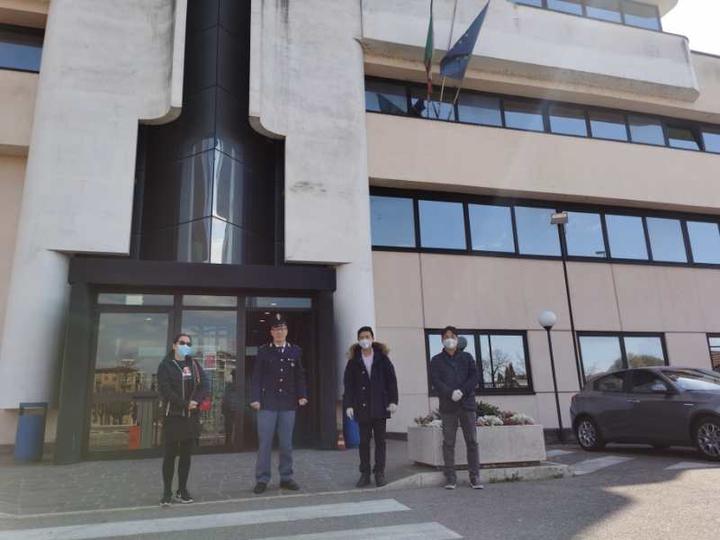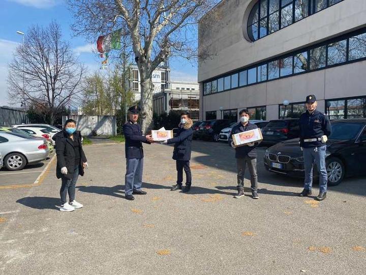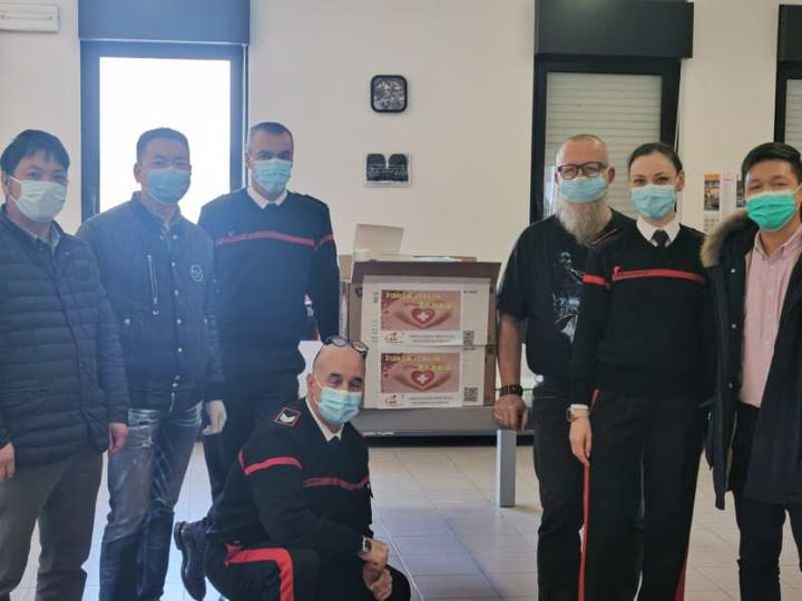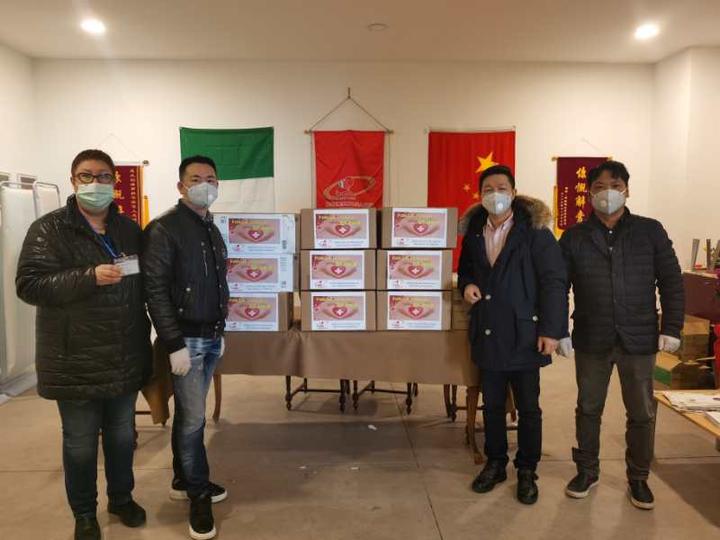 3月27日,意大利维罗纳华侨华人总商会长胡从炼、秘书长张梅、第一常务副会长洪海、执行会长金小银、会长助理金海国等人将会里采购和募集的防疫口罩等物资分别送到了当地政府、警务、卫生急需防护用品的部门手中。