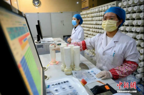 3月24日,山西省太原市,医务人员使用机器调配中医药剂。这些药品经装箱后将发往海外,助力侨胞抗击疫情。中新社记者 韦亮 摄
