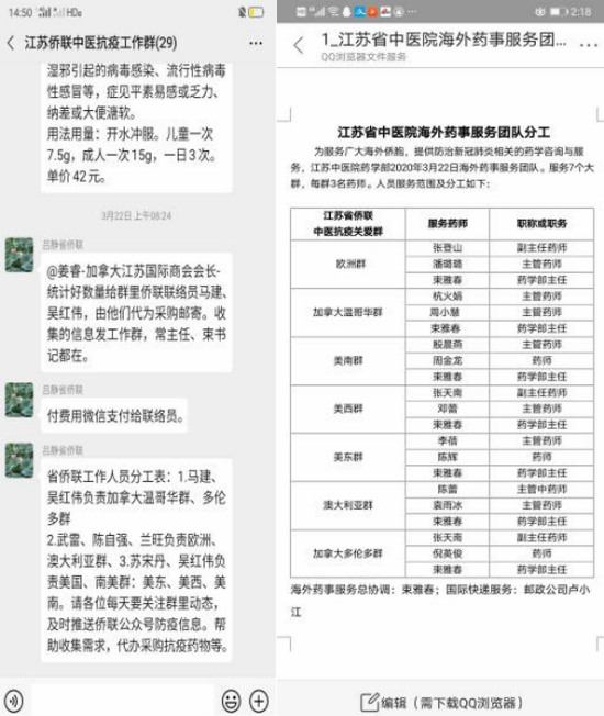 “中医抗疫关爱群”面向广大江苏籍海外侨胞,提供下列方式的抗疫服务:每天收集大家个性化的需求,形成文档集中交给江苏省中医院分析整理后统一回复;安排专家线上专题讲座,将专家讲课语音转成文档发送各群共享,扩大受众面;定期发布有关抗疫视频、信息,联系代办采购抗疫药物等。