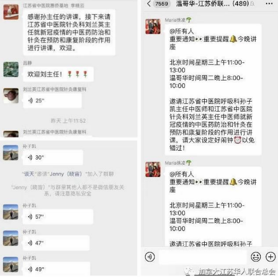 在微信群组建第一时间,美国、加拿大、澳大利亚、欧洲等国家和地区侨社团侨领积极响应行动,江苏省中医院药学部主任束雅春专门抽调14位药剂师团队进群提供咨询服务,惠侨基地主任常诚认真制订专家讲座计划。截止目前,江苏省中医院商宏涛、常诚、周江、卢子杰、徐静、陈列红、孙子凯、刘兰英等名医专家已进行了7次微信在线讲座。中国驻当地总领馆和有关华人华侨社团4000余人聆听讲座。加拿大同乡联谊总会李佳颖会长等热心听众还把专家讲课语音及时整理成音频资料进一步扩大网络传播范围,让中医抗疫知识惠及更多侨胞。