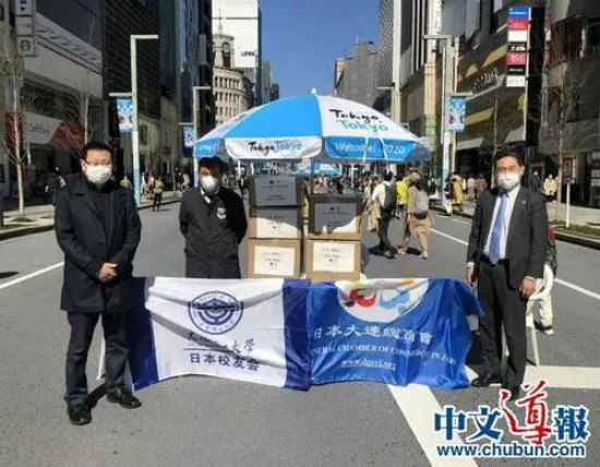华侨华人在日本东京向民众发放口罩。(来源:日本《中文导报》)