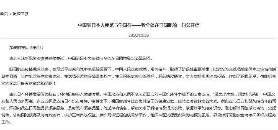 大使馆还接连发表致在日同胞的公开信,关切在日同胞安全健康;