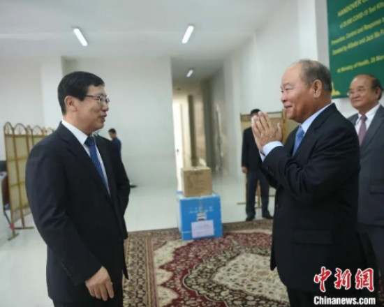 图为柬卫生部大臣曼本亨(右)向中国驻柬埔寨大使王文天(左)表示感谢。 黄耀辉 摄