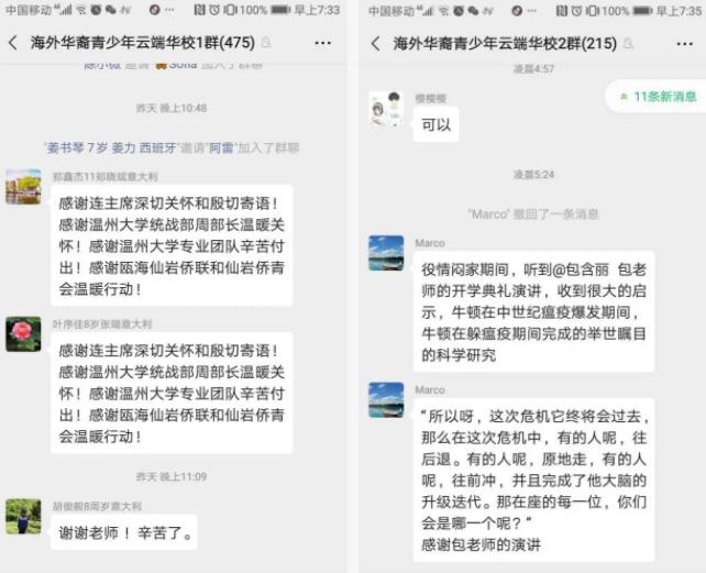 温州大学统战部部长周伟国在连线中说:“利用居家的日子‘停课不停学’,可以把危机转化为机遇,温州大学做为一所以侨为特色的综合性大学,愿意与海外侨胞一起并肩防疫,把居家的生活变地更加生动和丰富。”