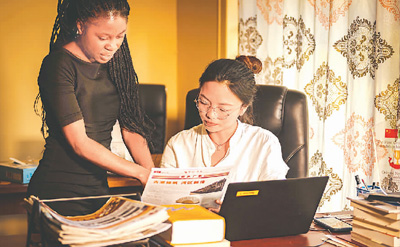 《非洲华侨周报》赞比亚分社编辑刘欢(右)和同事在值夜班。 (南庚戌供图)