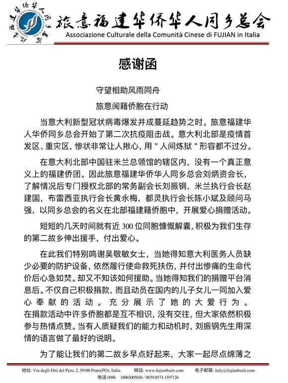 意大利北部是疫情首发区、重灾区,旅意福建华侨华?同乡总会刘炳资会长了解到,中国驻米兰总领馆辖区内没有一个真正意义上的福建侨团,专门授权常务副会长刘振钢、米兰执行会长赵建国、布雷西亚执行会长黄永梅、都灵执行会长陈小斌及顾问马强,以同乡总会的名义,在北部福建籍侨胞中开展爱心捐赠活动。