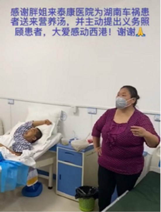 目前,殷寿强仍在医院中,一直由邓益明24小时自费陪护。泰康医院院长宁青林是湖南人,减免了殷寿强的部分治疗费用和药费。他说:“别说大家都是湖南人,只要是中国人,漂泊在外都应该要互相帮助。”特殊时期,生活各方面都多有不便,许多华人华侨带了自制的营养汤和粥,到医院看望殷寿强。3月30日,一位来自四川的“胖姐”不仅带了营养汤到医院,还主动留在医院义务照顾殷寿强。她说:“将心比心,如果我的家人在异国他乡受到伤害,我又无法及时到身边照料时,也希望有人能够帮我照顾。”