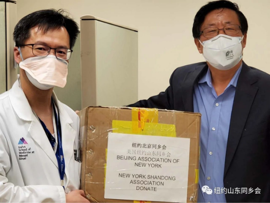 纽约山东同乡会法律顾问、北京同乡会副会长孙澜涛代表两会向艾姆赫斯特医院捐赠口罩。
