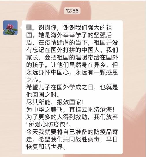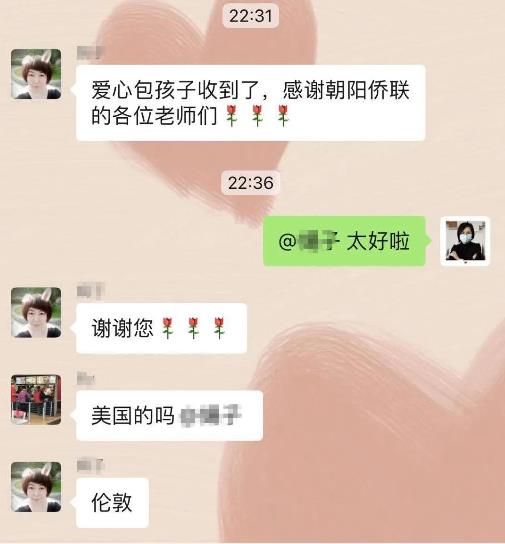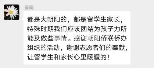 “谢谢您和朝阳侨联,在孩子们因为航班取消、美国疫情严重心情沉重的时候收到爱心包,感受到爱和关心……”