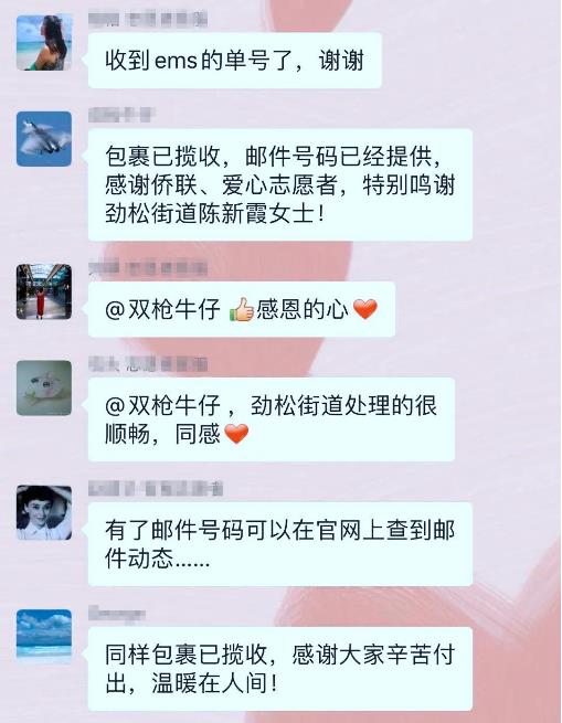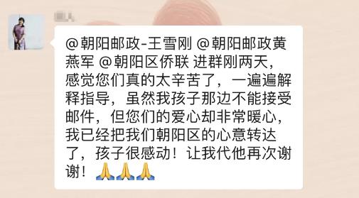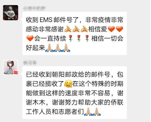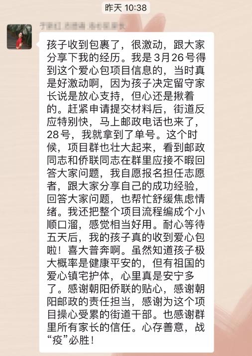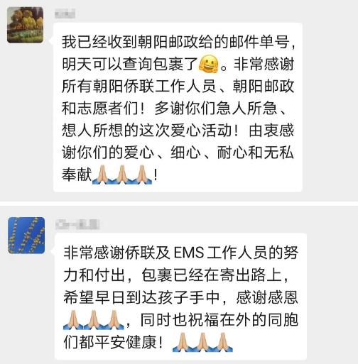 3月27日,朝阳邮政完成了第一批“侨爱心防疫包”的邮寄工作,一批留学生家长成功收到了物流运单信息。顺利寄出“侨爱心防疫包”的家长和侨眷们感激不尽,还有留学生家长没有领取“侨爱心防疫包”,但仍然表达谢意,向孩子传达祖国的温暖。