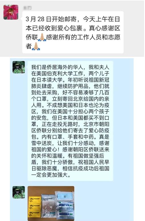 在全球疫情日益严峻,海外防疫物资短缺,国际快递困难的情况下,由50只口罩、100只手套,中药颗粒或胶囊等防护物资组成的“侨爱心防疫包”,为海外留学生和侨胞及时送去了朝阳区的一份牵挂,一份关爱,解决了留学生家长和侨眷们的燃眉之急。