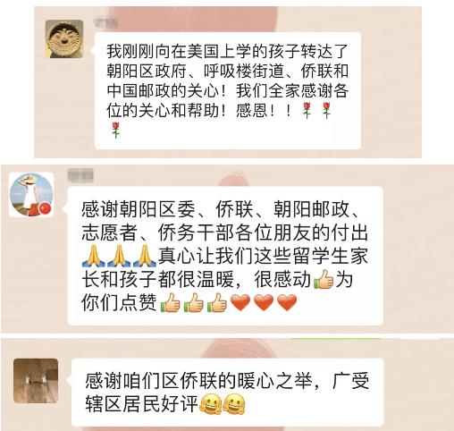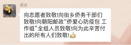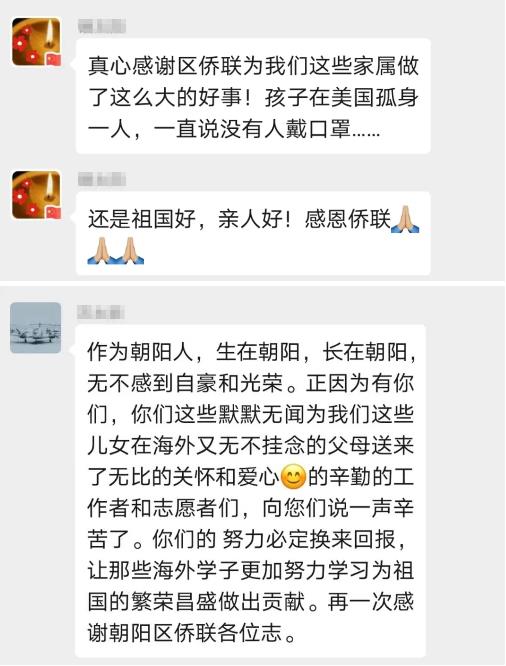 自朝阳区“侨爱心防疫包”申领信息发布后,朝阳区侨联就收到了留学生家长和侨眷们潮水般的咨询和感谢!