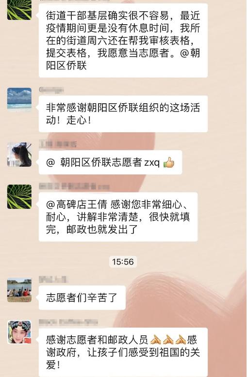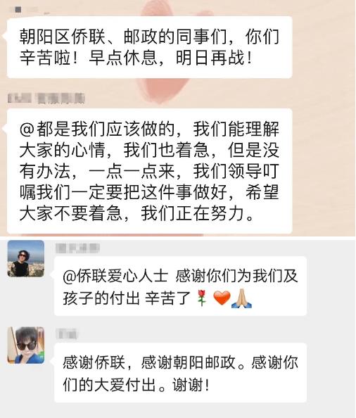 有一种情感叫同气连枝,有一种情怀叫守望相助,有一种责任叫义不容辞。“侨爱心防疫包”申领工作开始后,咨询电话应接不暇,通过微信群咨询的人数也很快突破1000人。为了让焦灼的留学生家长和侨眷们的咨询和登记审核不过夜,朝阳邮政分公司的同志们24小时在线,街乡侨联工作者们除了在疫情一线值守,还要随时解答大家的各种问题,并在每日下班前将当天登记的申请信息反馈给区侨联,确保爱心包及时寄出。