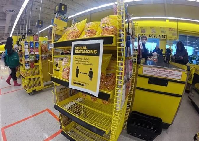 当地时间3月30日,加拿大大多伦多地区一家超市内贴出的告示提醒顾客,需保持社交距离。鉴于新冠肺炎疫情形势,多伦多所在的安大略省省政府当日宣布,该省的紧急状态于3月底期满后,将再延长两周时间。中新社记者 余瑞冬 摄