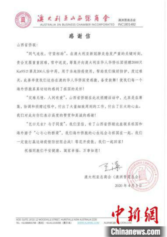 感谢信。澳洲晋商总会供图