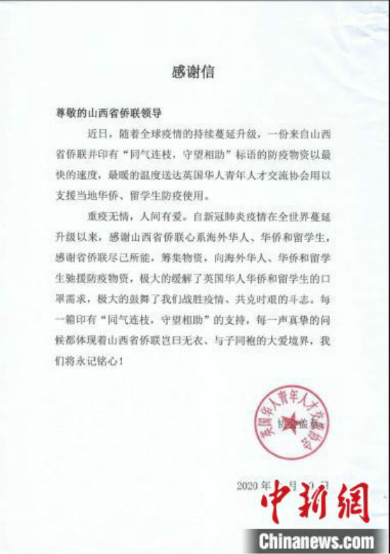 感谢信。山西省侨联供图