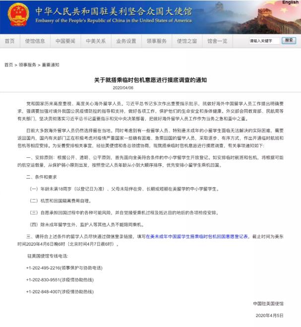 6日,中国驻美大使馆发布关于就搭乘临时包机意愿进行摸底调查的通知。