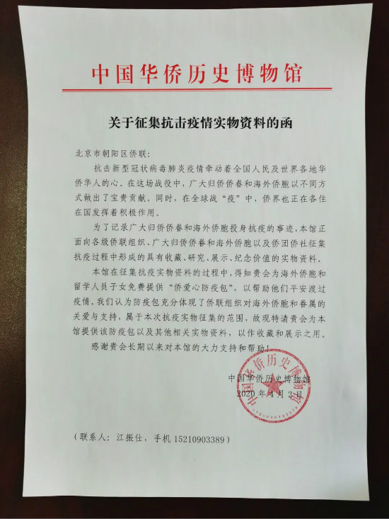 在全球抗击新冠肺炎疫情中,海外侨胞和归侨侨眷以不同方式作出了宝贵贡献。为了永久记录这段历史,中国华侨历史博物馆正面向各级侨联组织、广大归侨侨眷和海外侨胞以及侨团侨社,征集抗击疫情过程中形成的具有收藏、研究、展示、纪念价值的实物资料。目前已经收到来自美国、意大利、日本、法国、南非、印尼和韩国等国家,以及中国北京、重庆、福建和浙江等地的捐赠线索。
