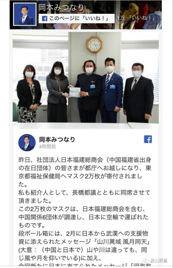 4月9日东京,日本福建总商会会长山口信一率领商会核心骨干,副秘书长吴瑞聪,常务副会长王平、张咏,理事王为金,事务局林升等。向日本日本众议院、东京都议会,东京都福利医疗机构捐赠5万枚防疫口罩。
