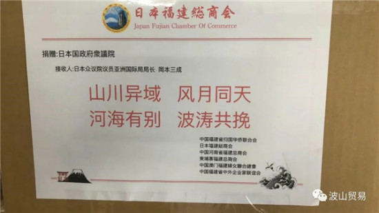 在接受捐赠仪式中岡本三成表示:山川异域,风月同天。河海有别,波涛共挽。体现中日两国悠久的友好交流历史,感谢日本福建总商会在应对瘟疫中对日本民众做出的努力与贡献,祝愿在我们的共同努力下,为中日友好尽每一份力。