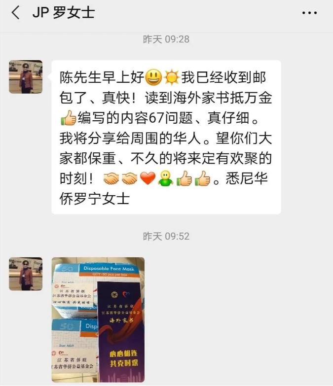 收到寄来的二盒口罩,感谢江苏侨联江苏华侨基金会的爱心,您们也保重!