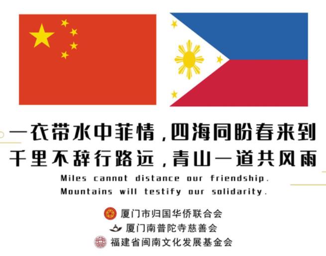 据了解,福建省闽南文化发展基金会、厦门市南普陀寺慈善会和厦门市归国华侨联合会十分牵挂海外乡亲的安全与健康,在不到一周时间内紧急筹措了81万个防护口罩,分别捐赠菲律宾总统特使图尔福(Ramon Tulfo)办公室、菲律宾海岸警卫队、菲律宾中信慈善基金会、菲中互助合作交流协会、菲律宾福建总商会、菲律賓廈門聯誼會、菲律濱漳廈龍同海總會(商會)、菲律宾菲华联谊总会、菲律宾缉毒署、菲总统府的咖雅渊经济特区及菲律宾大乘信愿寺等11个重点菲律宾侨社及有关机构,帮助社团乡亲防控疫情。