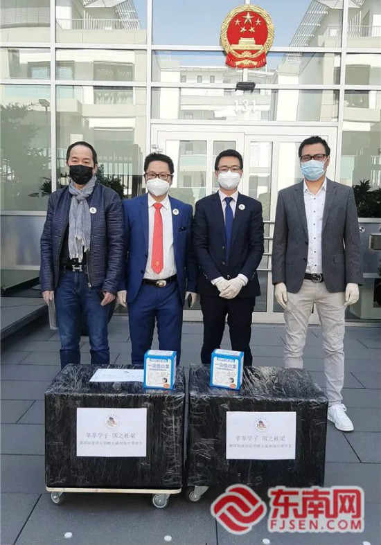 德国福建商会会长陈云斌(左二)带领商会成员向中国驻杜塞尔多夫总领事馆送去为留学生捐赠的口罩 德国福建商会供图