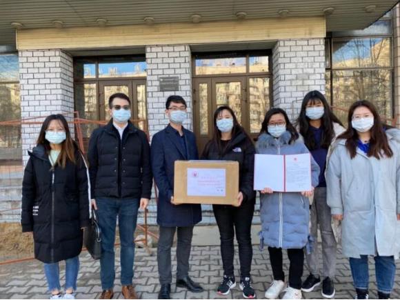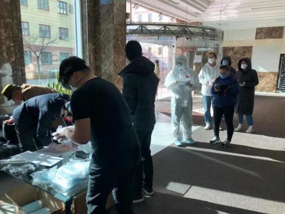 图为中国留学生会向圣彼得堡留学生分发总领馆筹措的口罩。总领馆供图