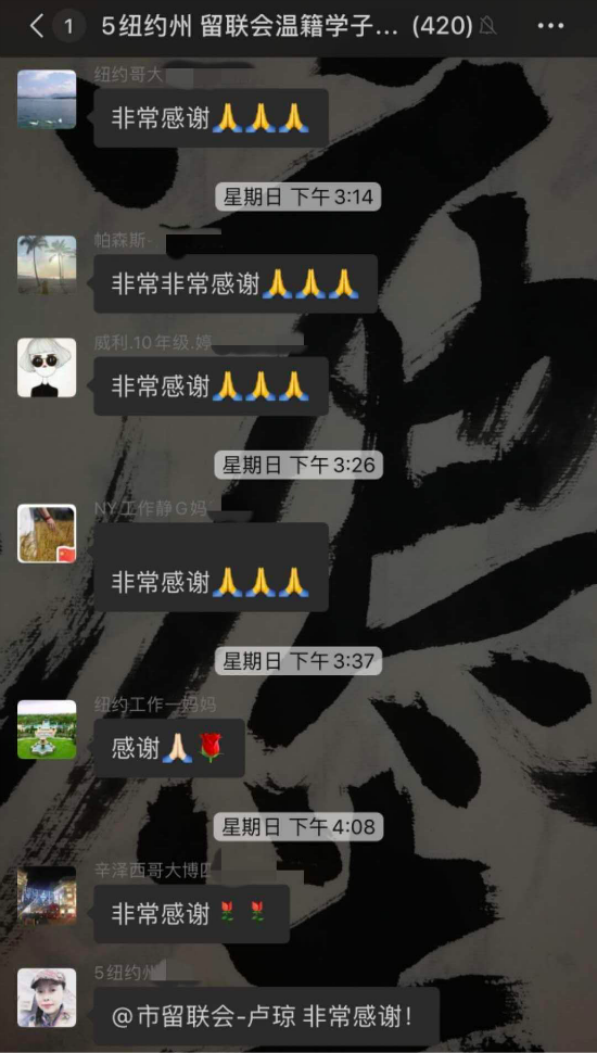侨胞的付出,留学生和家长看在眼里,记在心里。经过一个多月的联络,互助群的家长已经相互熟悉,留守同一地区的留学生开启抱团互助模式。有车的王梁坤,驱车三个小时,为温籍学妹送口罩;英国利兹大学温籍留学生林雅妮,向同校同学分享口罩、消毒水等防疫物资;身处纽约疫情重灾区的温州留学生吴思琪,组织艺术展传播防疫知识……