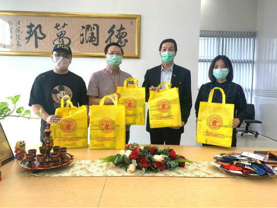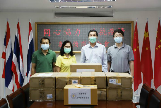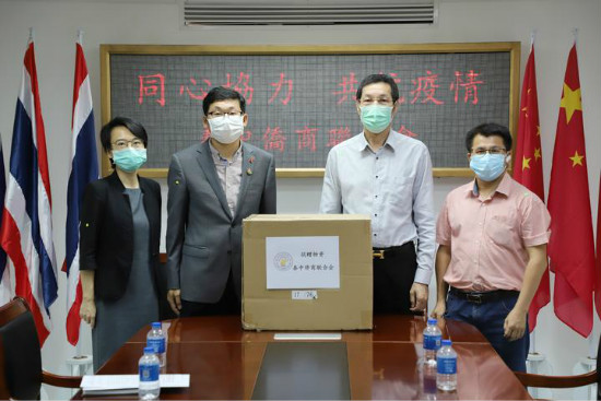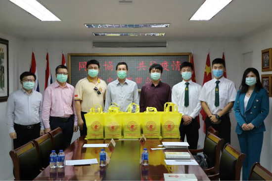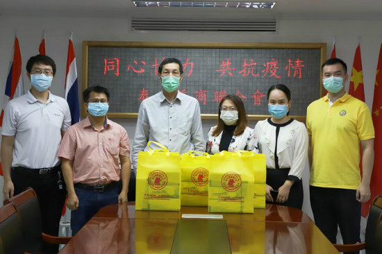 邝锦荣会长代表泰中侨商联合会为泰国正大管理学院捐赠防控物资,由洪风院长(左二)代为接收