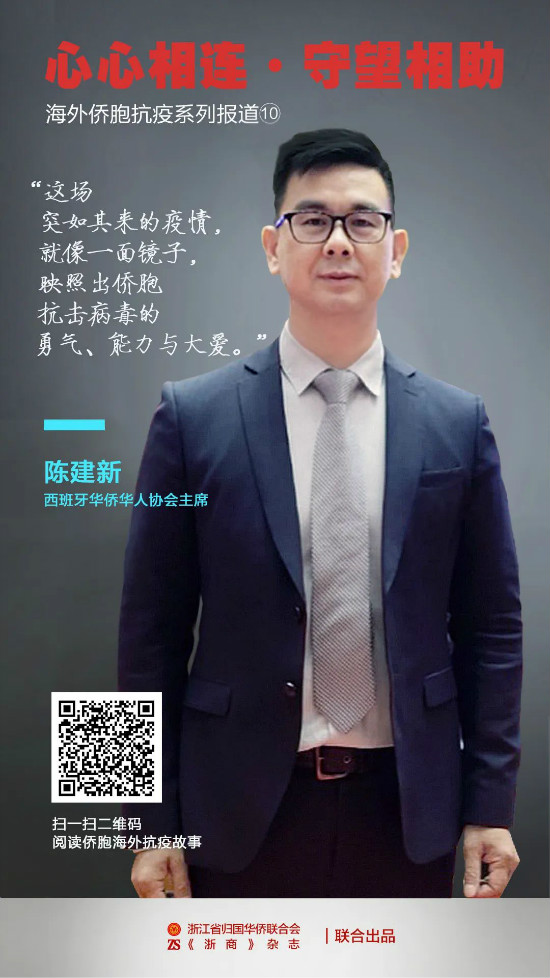 为展示这支大爱无疆的“侨力量”,浙江省侨联联手《浙商》杂志共同推出“心心相连 守望相助”侨胞海外抗疫特别报道,今天推出第十篇——西班牙华侨华人协会主席陈建新的故事。