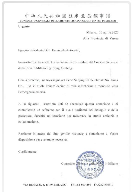 中国驻米兰总领事馆就天加捐赠口罩事宜沟通函