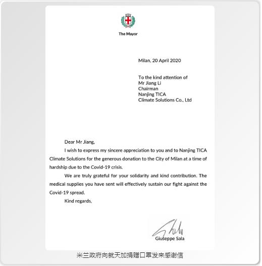 米兰政府在收到口罩后,第一时间向天加公司发来感谢信,并表示非常感谢天加公司对米兰市的捐赠,这批雪中送炭的物资将有效支撑其继续控制COVID-19疫情扩散。