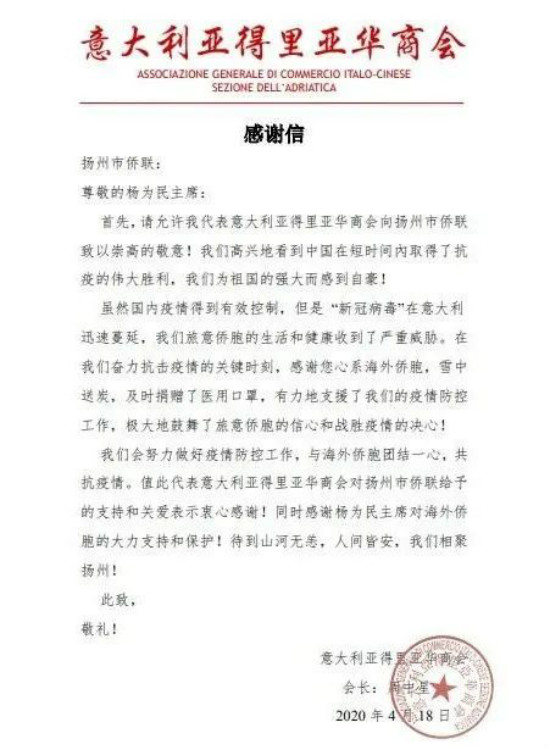 近日,意大利疫情稍一平稳,意大利亚得里亚华商会给扬州市侨联发来了感谢信,感谢扬州市侨联心系海外侨胞,在他们奋力抗击疫情的最困难的关键时刻,雪中送炭,及时给他们捐赠了医用口罩,极大鼓舞了旅意侨胞的信心和战胜疫情的决心。