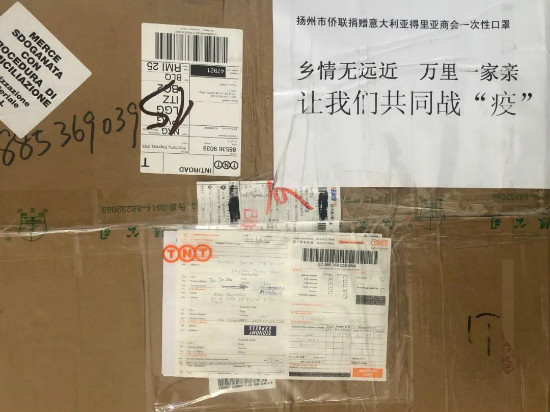 在国内疫情得到有效控制口罩依然紧张情况下,扬州市侨联关注到意大利疫情迅速蔓延,立即决定多方寻找符合出口标准的医用口罩回馈捐赠意大利亚得里亚华商会,感恩他们在国内艰难时刻的捐赠。3月16日,市侨联通过各种途径多方联系厂家筹措到一次性医用口罩4000只,在邮路不通畅的情况下想方设法发往意大利,辗转多日终于在4月1日送达到市侨联海外顾问、意大利亚得里亚华商会会长周中星手中,周中星会长说看到快递箱上“乡情无远近,万里一家亲,让我们共同战‘疫’”的话语时,感受到了祖国和侨联娘家的温暖,也给旅意侨胞坚定了战胜疫情的信心。周会长介绍,4月2日商会就把口罩分发给商会会员和意大利友好人士了,意大利友好人士表达了由衷的谢意,亚得里亚华商会的会员们和意大利当地友人携手抗疫,拉近了两国人民之间的距离,建立了深厚的友谊,加深了彼此的信任,增强了共克时艰的信心。