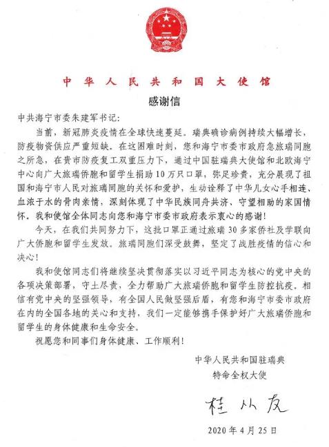 当天,驻瑞典大使桂从友在使馆出席了发放仪式。当天,桂从友大使还专程发来感谢信,向海宁市委书记朱建军及海宁市委、市政府和全体海宁市人民致以衷心的感谢。