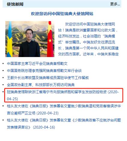 4月25日,驻瑞典大使馆在官网首页使馆新闻刊登关于海宁防疫物资的报道,曹海嘉感慨地说,“祖国和家乡永远是大家坚强的后盾,彰显了潮乡儿女同舟共济、患难与共的赤子之心。”