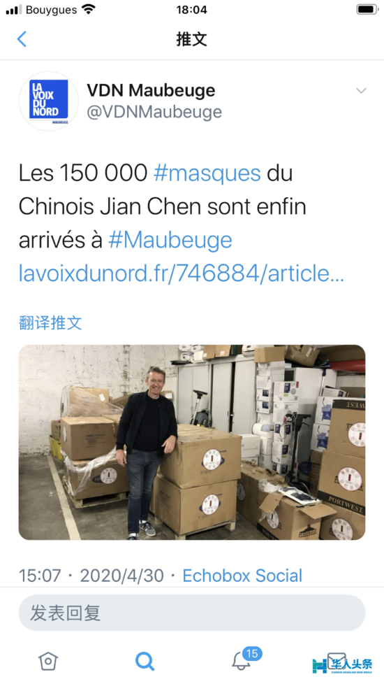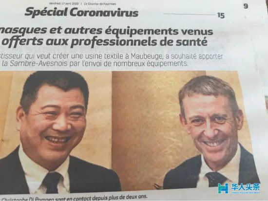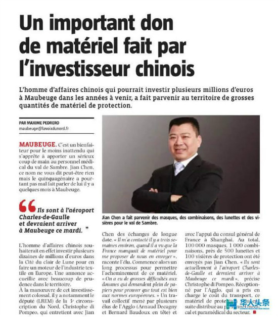 当地时间5月1日,法媒《北方之声报》头条以“中国投资者捐赠大量的医疗物资”为标题作了大篇幅报道。推特、脸书、网站上都纷纷转发……