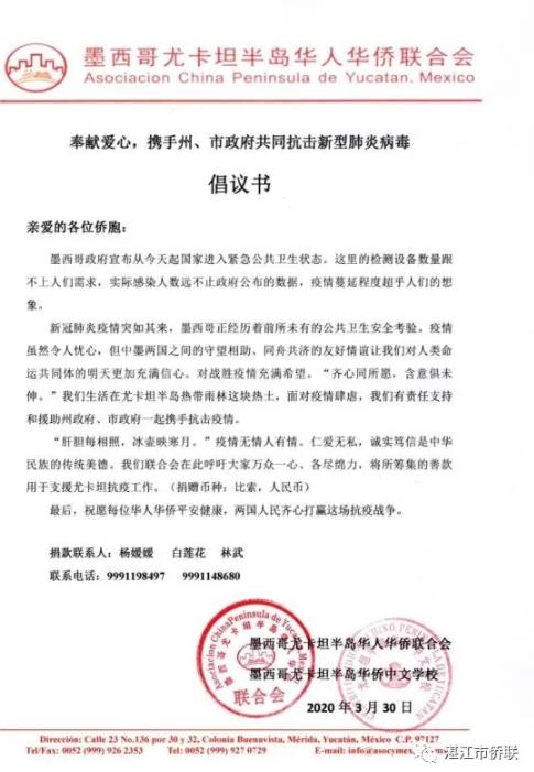 4月10日、11日,尤卡坦半岛华侨华人联合会分别向尤卡坦州和梅里达市政府捐助了一次性医用口罩共4万个。其间,华联会还协同市政府到玛雅村落为居民赠送口罩及其他抗疫物资,把中国侨胞的一片爱心献给当地政府和民众,携手州政府、市政府“守望相助,共克时艰”拉开抗疫活动的序幕,受到当地政府和社会的一片赞扬,为侨胞融入当地社会夯实基础。