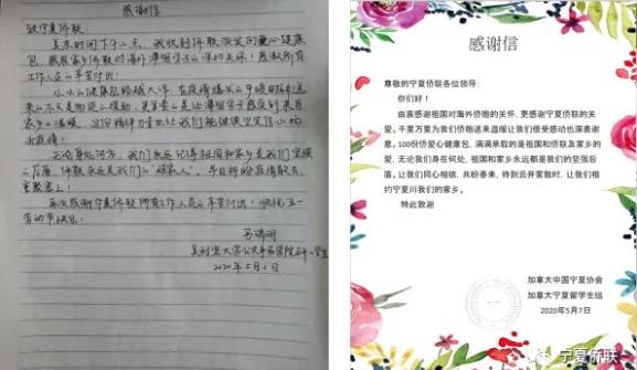 身处异国他乡,来自家乡的健康包让海外游子们特别暖心,一句“同心相依,守望相助,同气连枝,共盼春来!”的祝福语,饱含着“娘家人”对海外侨胞最温暖的关心和牵挂。“谢谢关心,远在万里之外的加拿大宁夏籍侨胞和留学生,在这个特殊的时刻,收到的不仅仅是口罩,还有来自祖国对海外侨胞的关怀,这关怀和感动将永远留在我们心里!谢谢!”加拿大中国宁夏协会转达了侨胞和留学生们对宁夏侨联的谢意。美国、意大利等地侨胞和留学生们也陆续收到了爱心包,并通过转发朋友圈、写下感谢的话语,表达了对祖国和家乡侨联的感激之情。