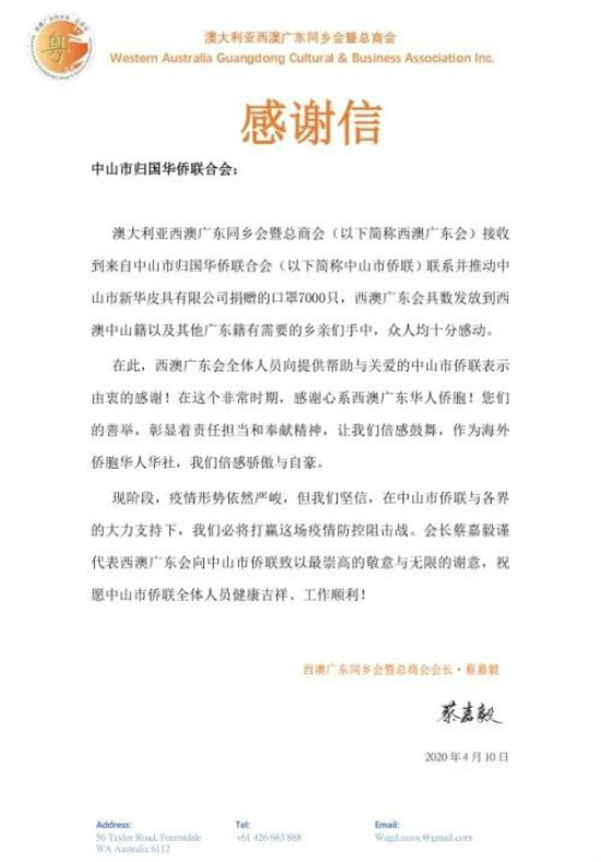 旅哥中山联谊会、西澳广东同乡会暨总商会致市侨联感谢信。
