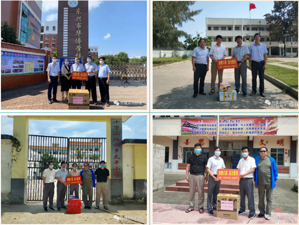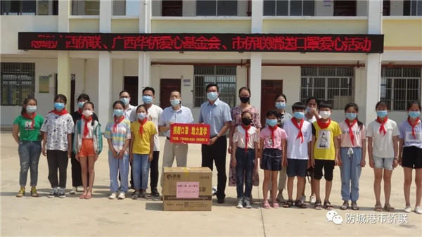 目前,我区疫情防控工作进入常态化,防城港市内各个学校逐渐有序开学,为支持归侨侨眷学生安全返校学习,近日,防城港市侨联部分机关干部在林威爵主席的带领下,先后来到东兴市华侨学校、东兴市实验学校、东兴市中学、上思县昌菱小学、港口区企沙镇华侨学校、十万山瑶族乡双峰小学、太平小学等7所归侨侨眷子弟较为集中的学校,赠送自治区侨联和广西华侨爱心基金会捐赠的8000个一次性医用口罩,充分表达各级侨联组织对当地学校和学生的关爱。