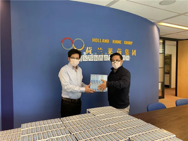 湖南省侨联海外顾问、莱茵集团董事长、荷兰湖南商会会长彭锦路(右)收到了国内捐赠的物资,并捐赠给当地卫生防控机构。