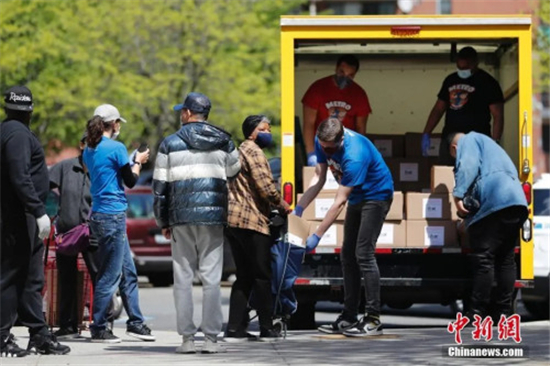 资料图:一个公益组织在纽约市皇后区一个居民区发放免费的500份餐食,民众排队领取。疫情期间,纽约市公立学校等地点都会有免费餐食发放。中新社记者 廖攀 摄